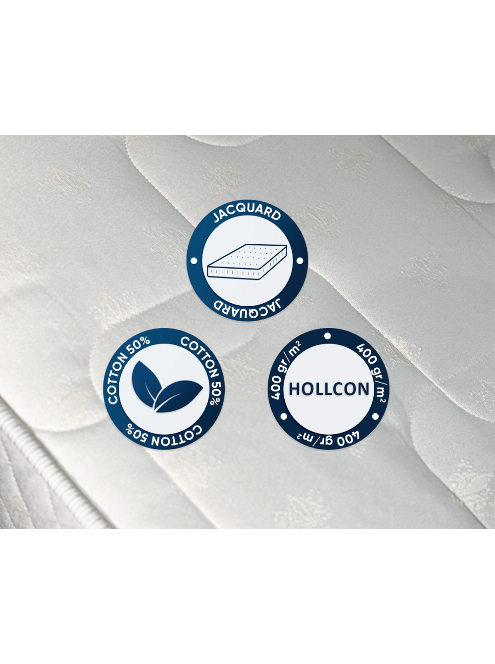 Чехол несъемный выполнен из прочной, износостойкой ткани жаккард люкс, простеганной на объемном холконе в сочетании с пеной Memori Foam. Благодаря чему в матрасе создается дополнительный анатомический слой, продлевается срок эксплуатации, изделие приобретает неповторимый внешний вид. 3D сетка по периметру матраса обеспечивает хорошую вентилируемость и сохраняет оптимальный микроклимат во время сна.
